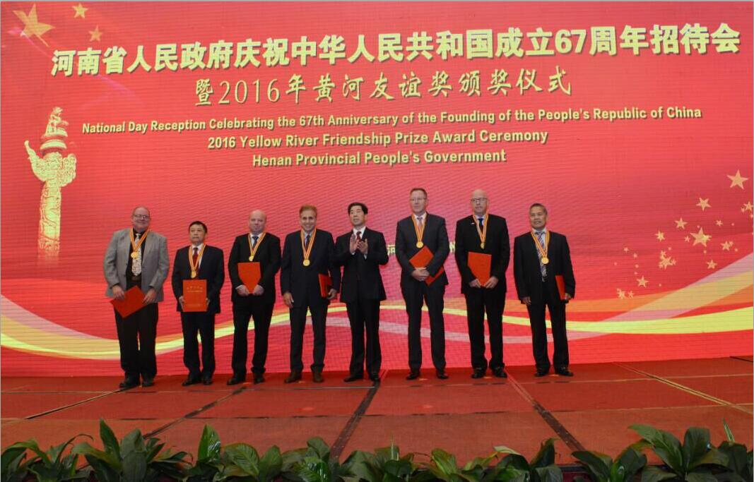 On 29th, September, Henan Provincial Government held a grand reception to celebrate the 67thanniversary of the founding of the People's Republic of China. Deputy Party Secretary of the CPC Henan ProvincialCommittee, Governor of Henan Province, Mr. Chen Runer attended the reception and awarded 8 foreigners including former CargoluxPresident & CEO and consultant of HNCA, Dirk ReichYellow River Friendship Prize for 2016.