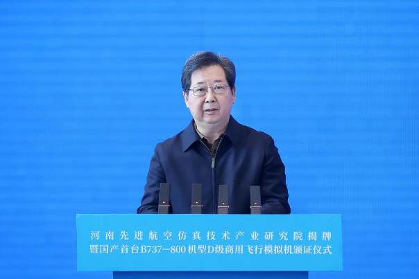 11月26日,河南先進(jìn)航空仿真技術(shù)產(chǎn)業(yè)研究院揭牌暨國產(chǎn)首臺B737-800機型D級商用飛行模擬機頒證儀式在航空港區(qū)舉行。省委書記樓陽生出席并講話。