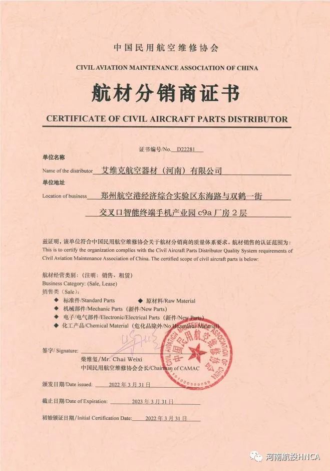 07 河南首家 填補(bǔ)空白 艾維克河南公司取得《航材分銷(xiāo)商證書(shū)》