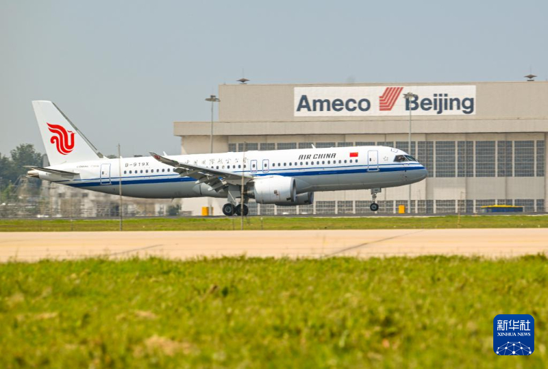 8月29日,國航首架C919國產(chǎn)大飛機(jī)降落北京首都國際機(jī)場(chǎng)。新華社記者 李賀 攝